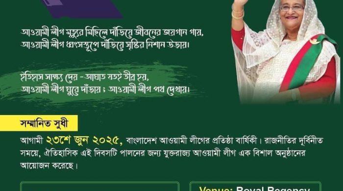 ২৩ জুন ২০২৫, সোমবার পূর্ব লন্ডনের রয়াল রিজেন্সি হলে, বাংলাদেশ আওয়ামী লীগের ৭৬তম প্রতিষ্ঠাবার্ষিকী উপলক্ষে যুক্তরাজ্য আওয়ামী লীগ কর্তিক আয়োজিত অনুষ্ঠানে দলের সভাপতি ও সাবেক read more