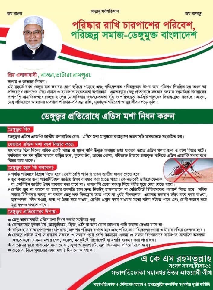 ডেঙ্গু একটি প্রাণঘাতী ভাইরাসজনিত রোগ, যা এডিস মশার মাধ্যমে ছড়ায়। ডেঙ্গু প্রতিরোধ ও পরিস্থিতি মোকাবিলায় মাননীয় সংসদ সদস্য এ কে এম রহমতুল্লাহ জনগনের উদ্দেশ্য বিবৃতি দিয়েছেন এবং সামাজিক সচেতনতা মূলক কাজের আহবান জানান ।